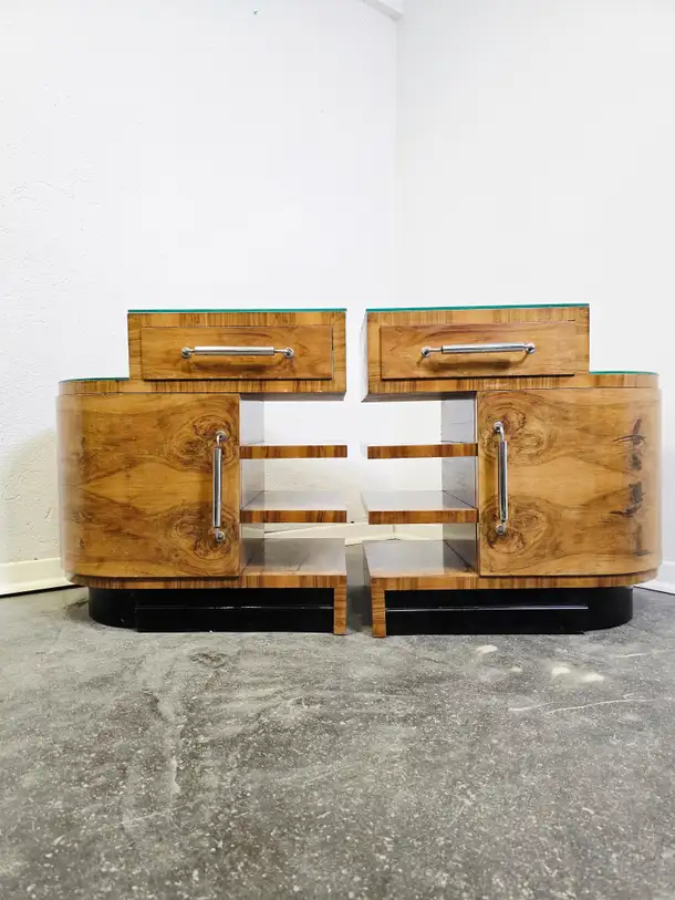 30s Art Deco Nightstands with a walnut veneer and glass top are a beautiful vintage piece from Slovenia. Sold as a set. $1996