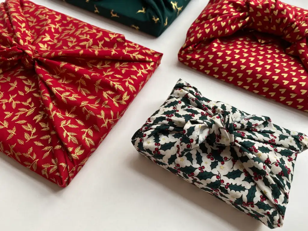 Furoshiki is a traditional Japanese wrapping cloth used for gifting that can be reused again and again. To wrap gifts, place the item in the center and bring the opposite corners together, tying knots over the item. Tuck the ends for a neat finish.
